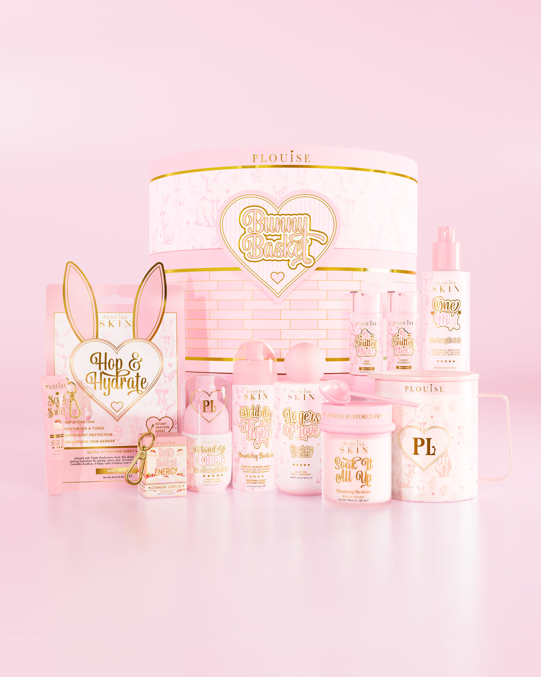 Este pacote de beleza de Páscoa de edição limitada é embalado dentro da cesta aprovada pelo coelhinho mais fofo e repleto de maquiagem que aumenta o brilho, cuidados com a pele que amam barreiras e guloseimas de autocuidado que cheiram como o paraíso do bolo de morango. Pense em hidratação, fixação, blush, cuidados com o corpo e bolhas, tudo embrulhado em um pacote de cuidados com a pele de Páscoa.