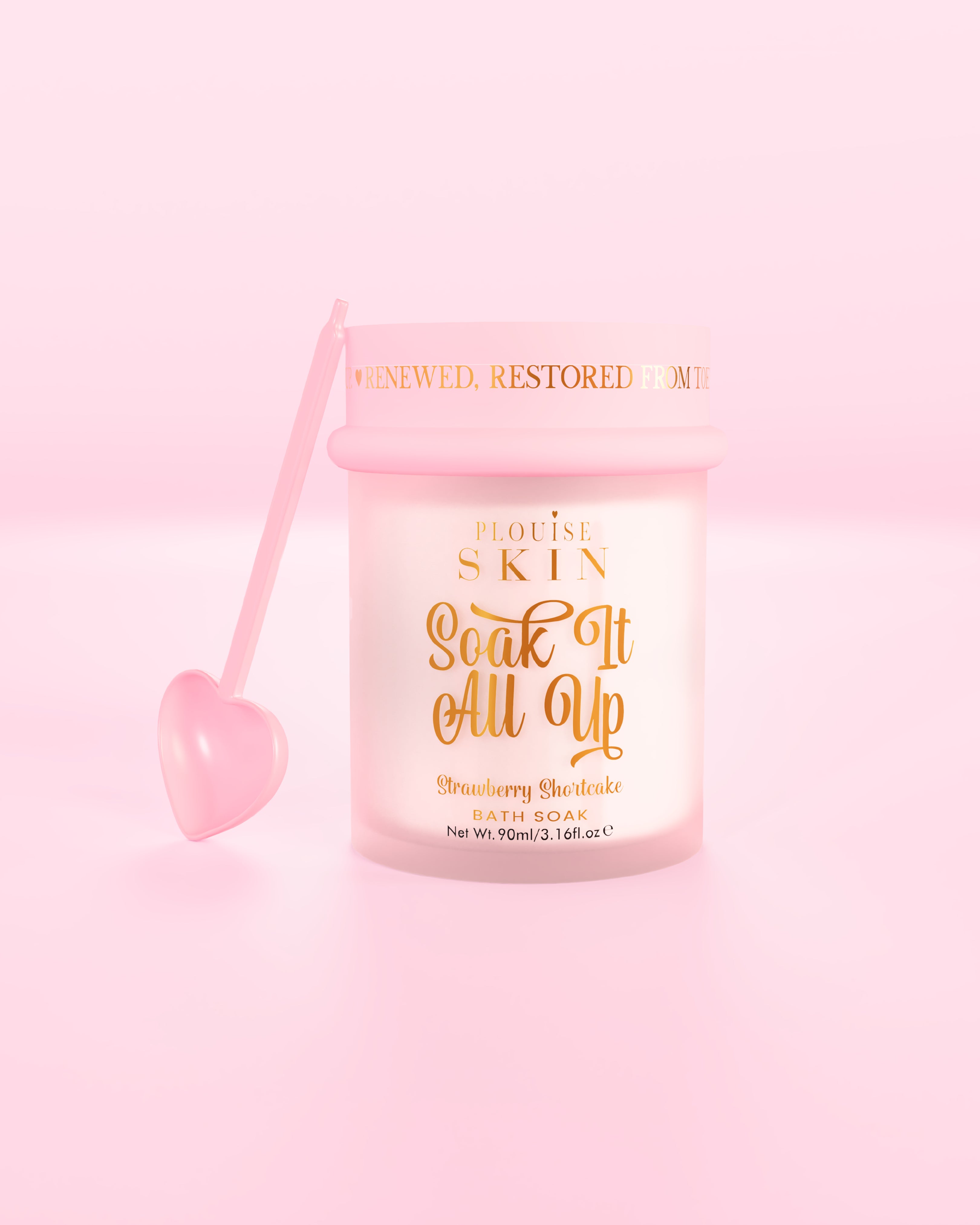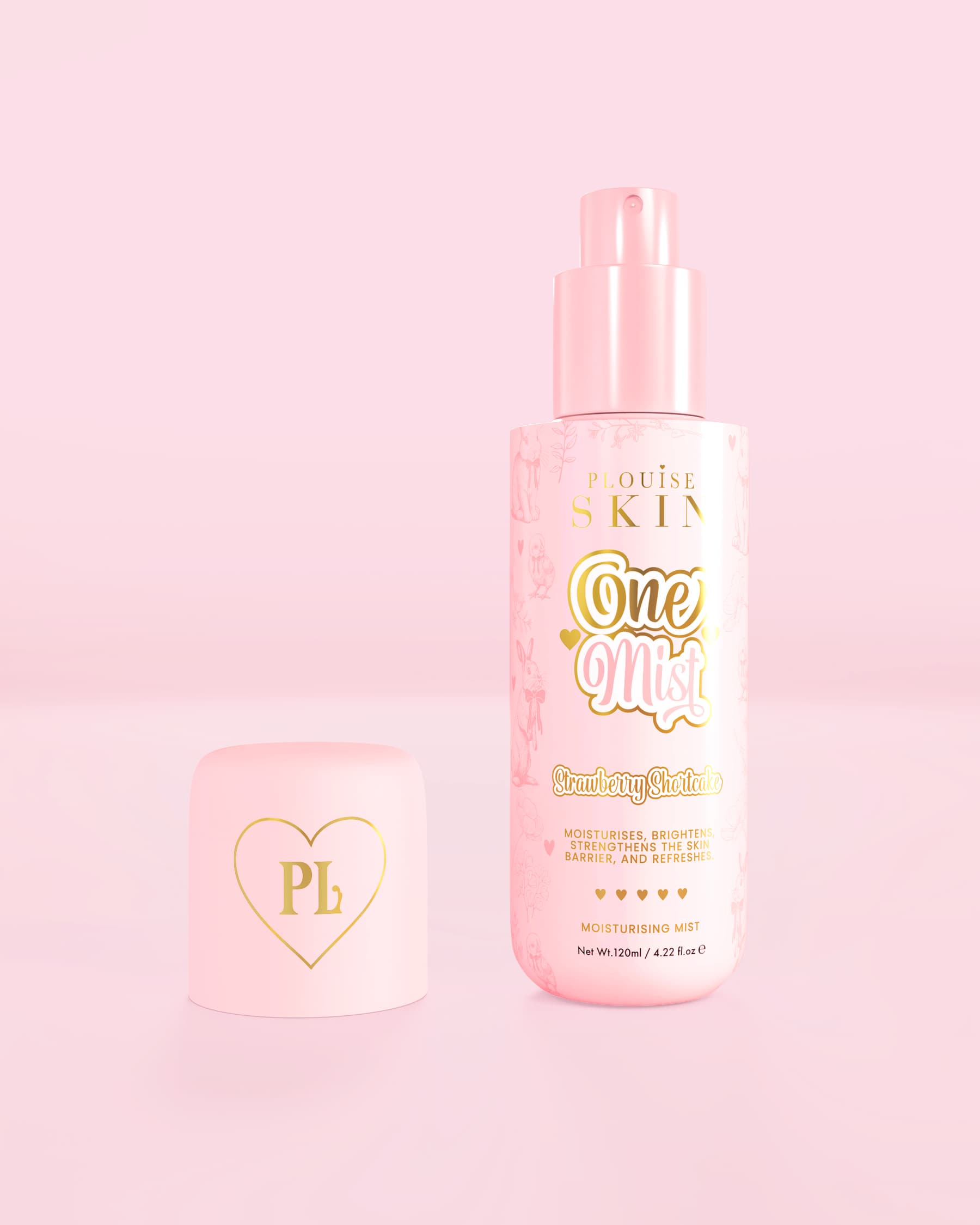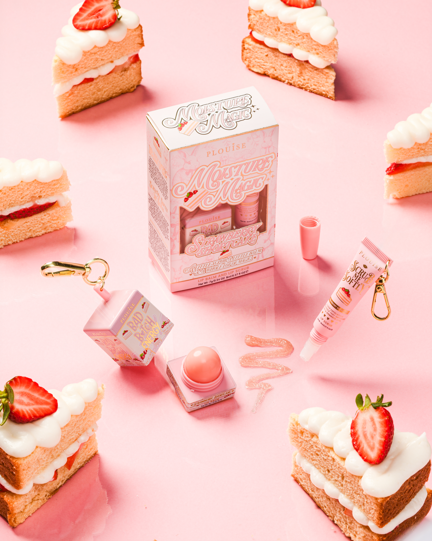 Bolo de morango perfumado e enriquecido com niacinamida para hidratação iluminadora, óleo de semente de uva para nutrição antioxidante, carnosina para fortalecer a pele e extrato de beldroega para suporte calmante.