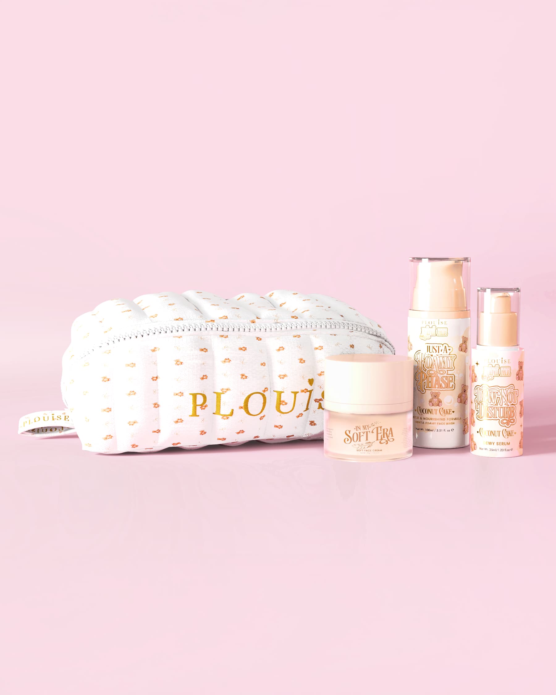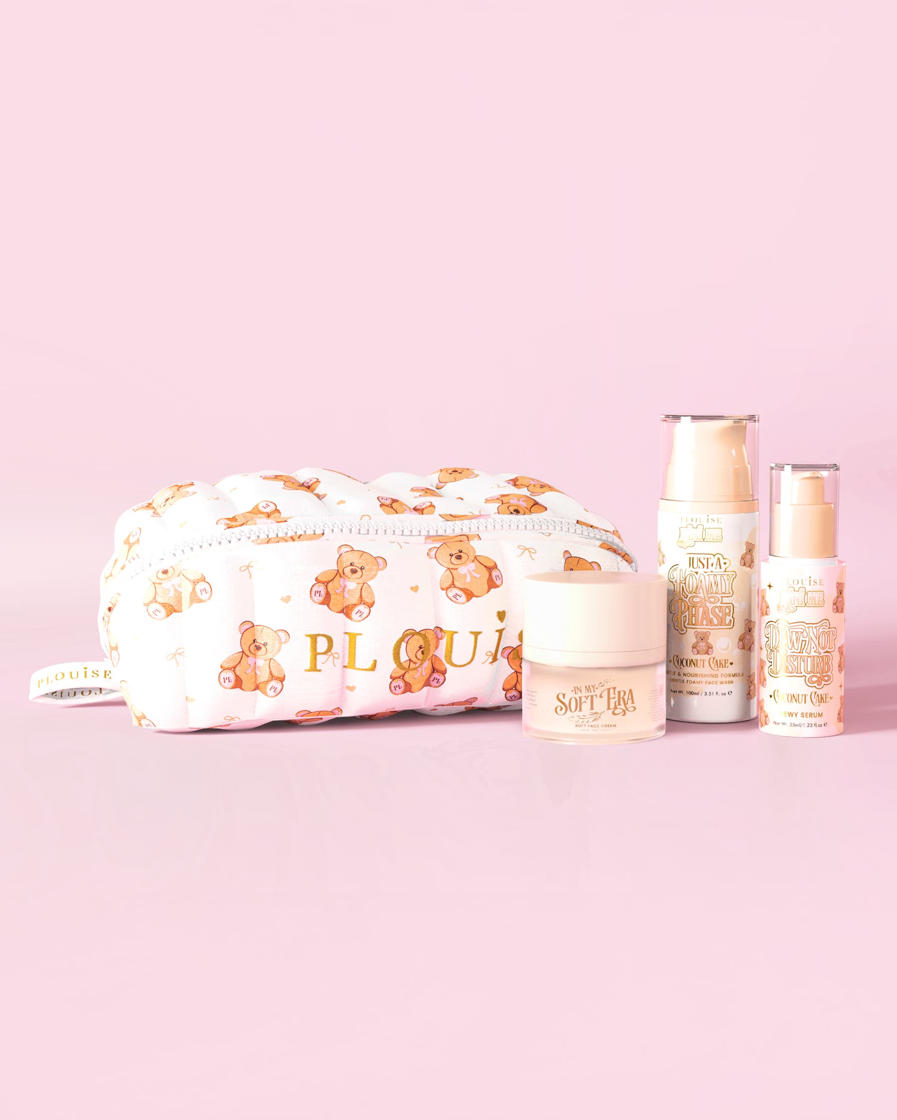 Apresentando o Kit inicial de toque mais suave, um conjunto de bem-estar concebido para manter os seus produtos essenciais de cuidado de pele organizados, protegidos e perfeitamente combinados. Cada kit vem completo com três produtos favoritos de cuidados com a pele Coconut Cake, todos embalados dentro da bolsa de maquiagem Teddy Bear de sua escolha.